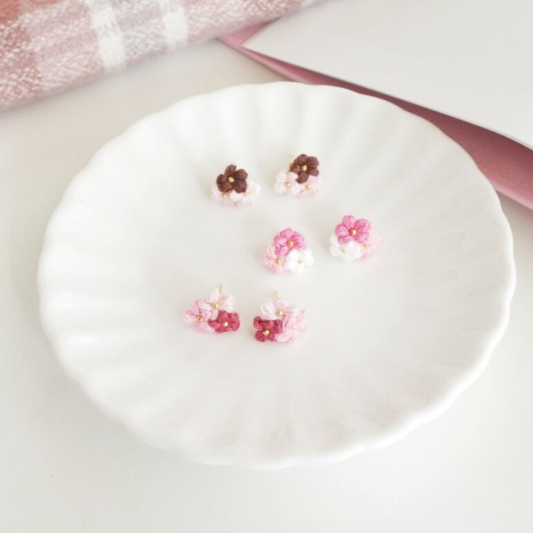 刺繍糸で編まれたふんわりお花がちょこんとまとまった、花束のようなピアスです。